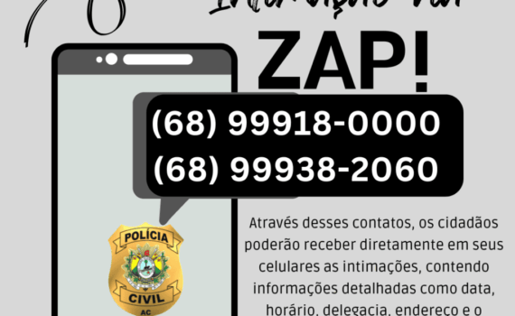 A Polícia Civil do Acre (PCAC) anunciou, nesta segunda-feira, 9, que continua a utilização da ferramenta tecnológica para tornar mais ágil e eficiente a comunicação com os cidadãos, como o envio de intimações por meio do aplicativo WhatsApp. A medida visa otimizar diligências investigativas e garantir maior celeridade na entrega de resultados à população. Imagem: divulgação Para isso, foram divulgados dois números oficiais que serão utilizados exclusivamente para esse fim: (68) 99240-0726 e (68) 99918-0000. Por meio desses contatos, os cidadãos poderão receber diretamente em seus celulares as intimações, contendo informações detalhadas como data, horário, delegacia, endereço e o documento […]